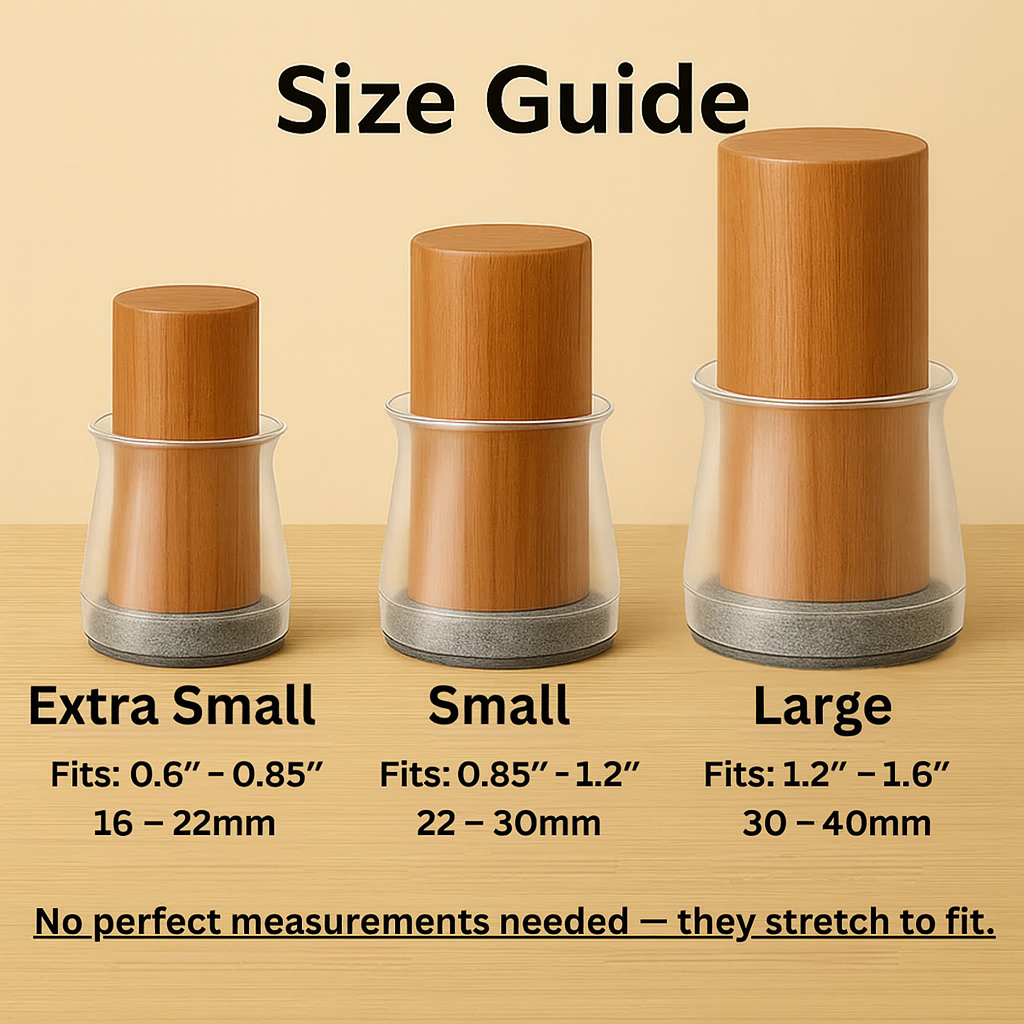 No need for precise measurements—just visually compare your chair leg to the sizes shown. This chart displays the real difference between Extra Small, Small, and Large using actual chair legs and socks.